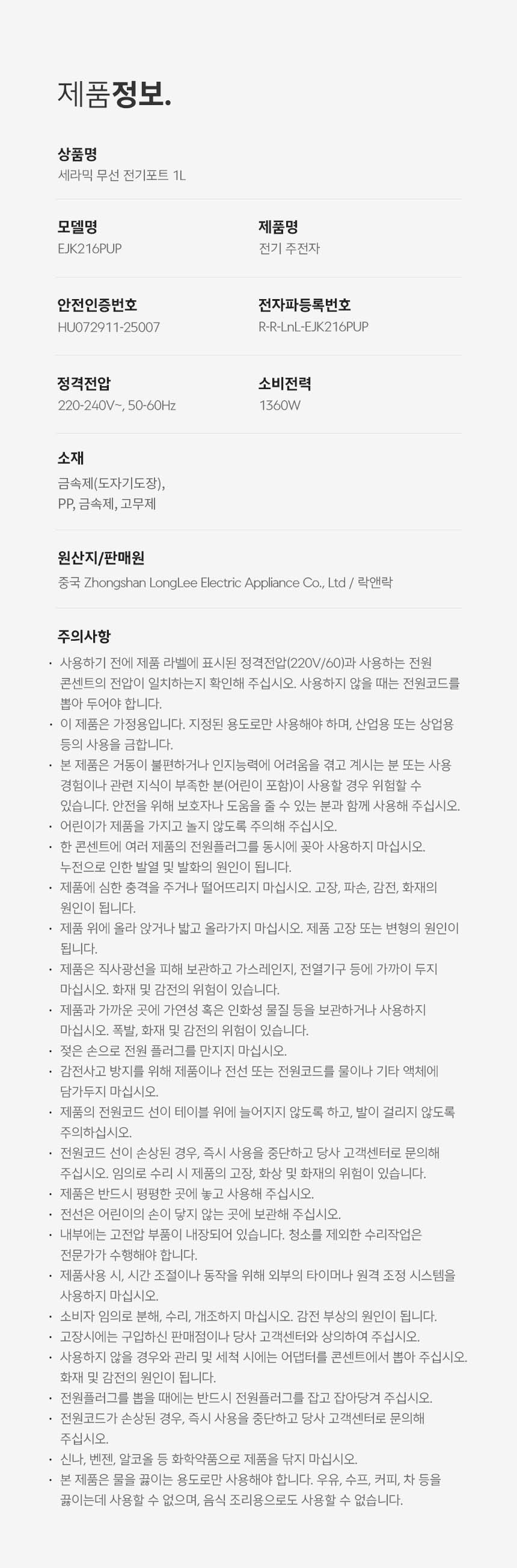 EJK216PUP ¼¼¶ó¹Í ¹«¼± Àü±âÆ÷Æ® 1L |